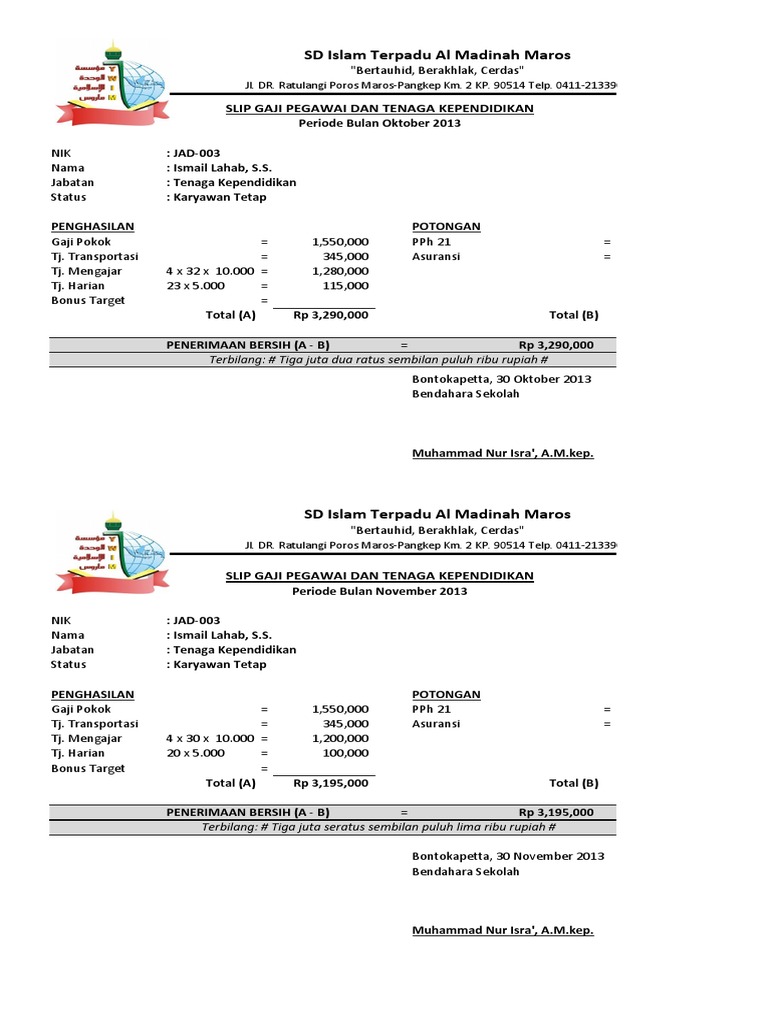 7 Contoh Slip Gaji Sederhana Format Cara Membuatnya from tugaskaryawan.com Jika perusahaan sudah memiliki aplikasi pengelolaan gaji karyawan maka pencetakan slip gaji akan sangat mudah dilakukan. Slip gaji merupakan bukti otentik atau bukti fisik secara resmi untuk penerimaan gaji dari sekolah yang lebih dikhususkan untuk guru. Misalnya, dalam sel deduksi, anda bisa. Karena pada slip gaji versi bank, biasanya tidak ada rincian gajinya. Format slip gaji excel download contoh slip. How to prepare salary slip in excel? Slip gaji juni (2) sd islam terpadu al madinah maros bertauhid, berakhlak, cerdas jl. Format perhitungan gaji karyawan ini menggunakan rumus excel sehingga hasilnya akan muncul otomatis dengan ketentuan liburnya setiap.
